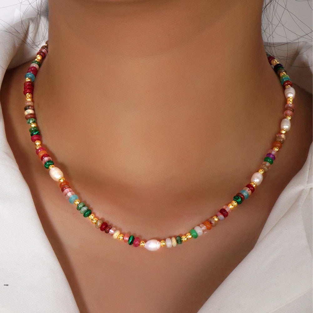 Bohemian Rainbow Natural Stone & Freshwater Pearl Roundle Beads Necklace, Handmade Boho Jewelry AL990